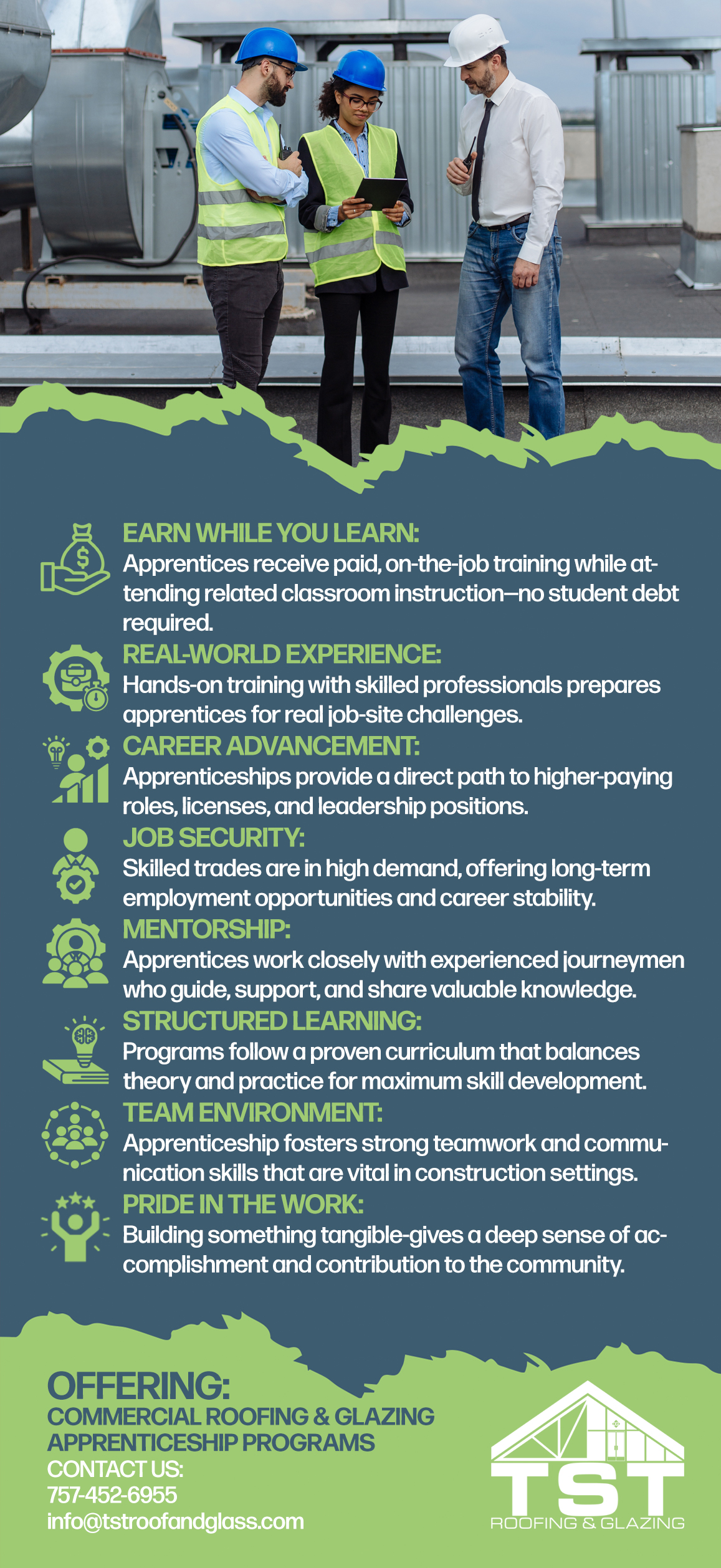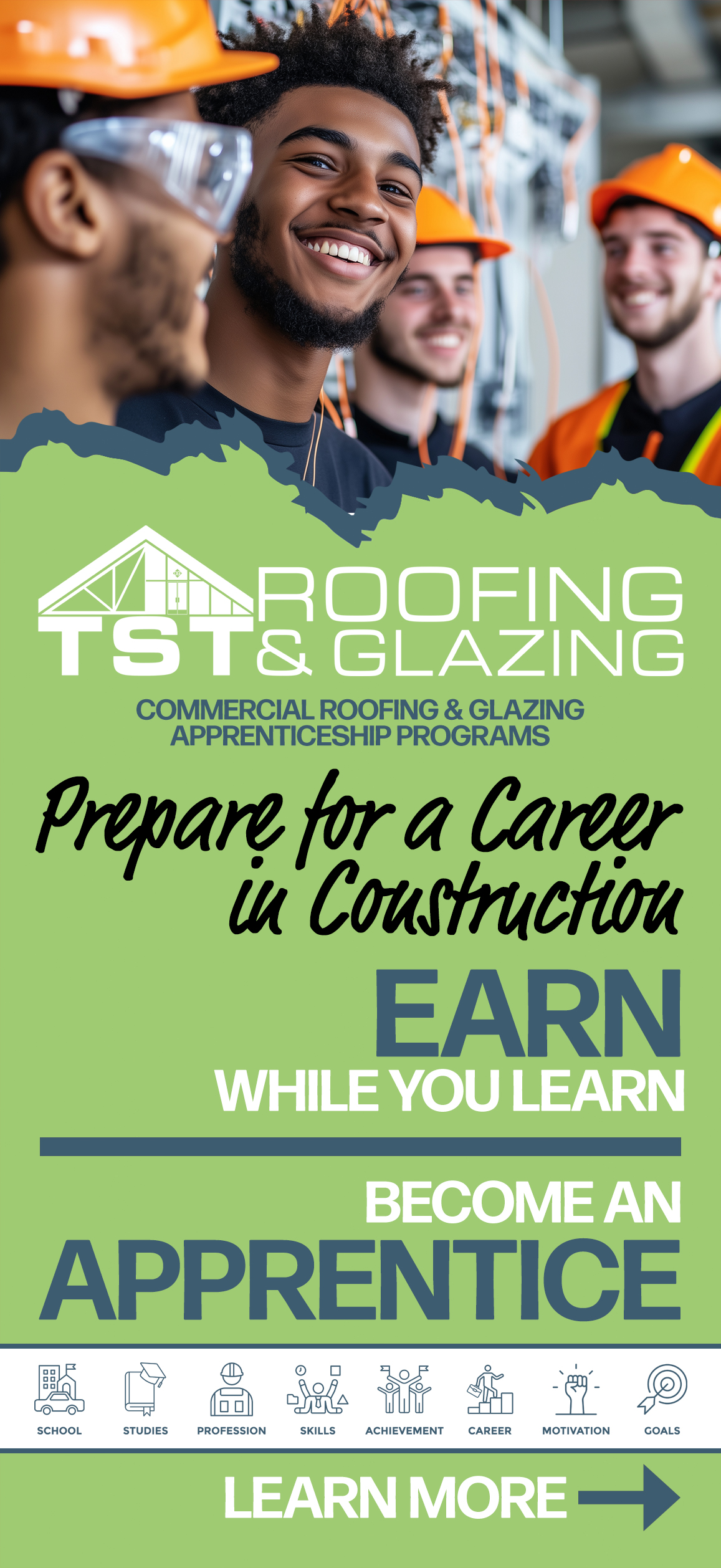 At TSTRG, we believe the best way to build skilled professionals is through hands-on training, strong mentorship, and real-world experience. Our Commercial Roofing and Glazing Apprenticeship Programs are fully state-licensed and approved, providing structured, credentialed training designed to develop highly skilled trades professionals. designed for individuals who want to learn a trade, earn a paycheck, and build a long-term career in construction.